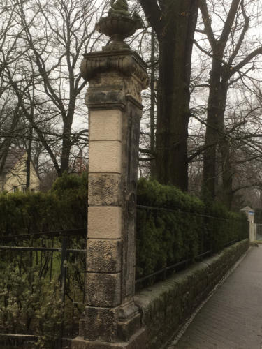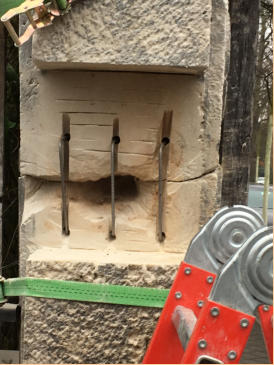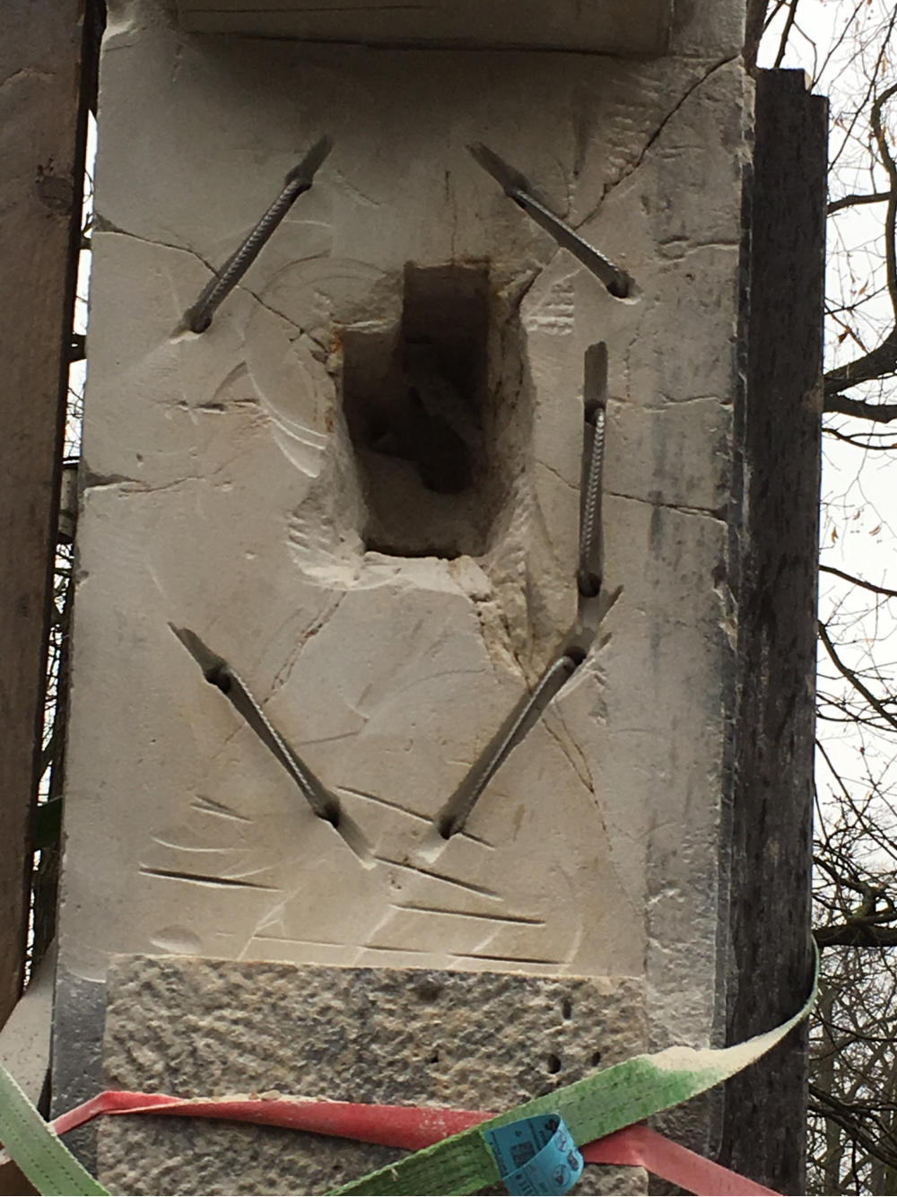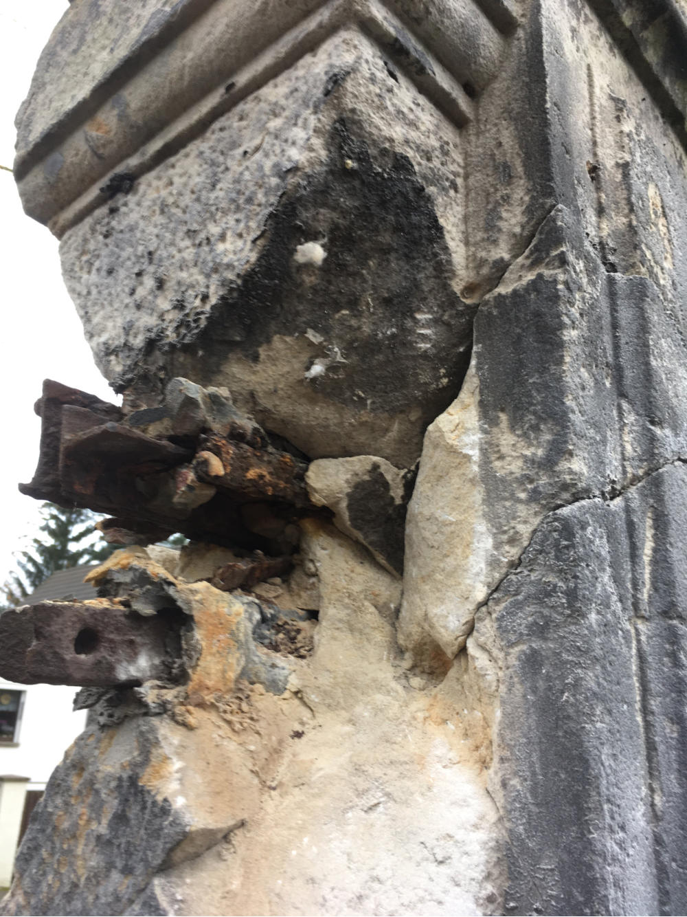 Die Pfeiler zeigten neben den typischen Verwitterungen auchgravierende Schädigungen durch “Rostsprengung”.Diese waren das Resultat der Eisendorne welche im Sandstein verankert waren und als Toraufhängung dienten.Nur durch umfassende Sicherungsmaßnahmen durch Anker und Klammern aus Edelstahl konnten die Pfeilergesichert und vor dem Abriss bewahrt werden.