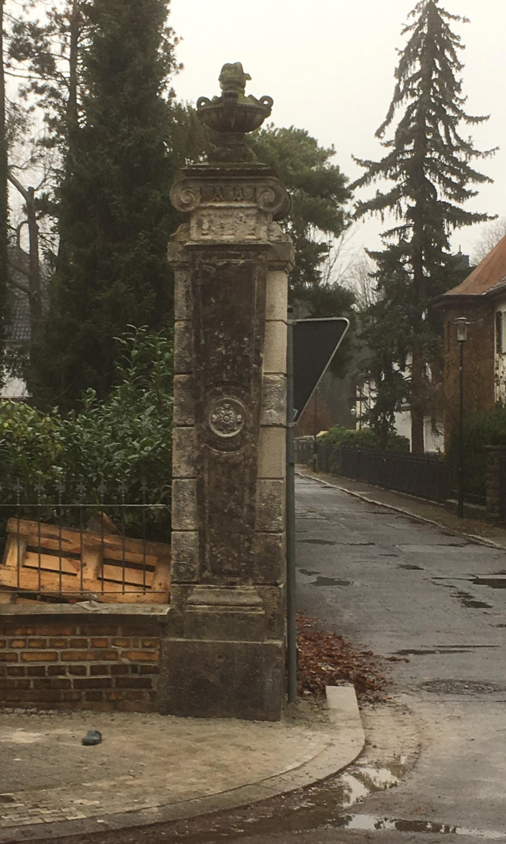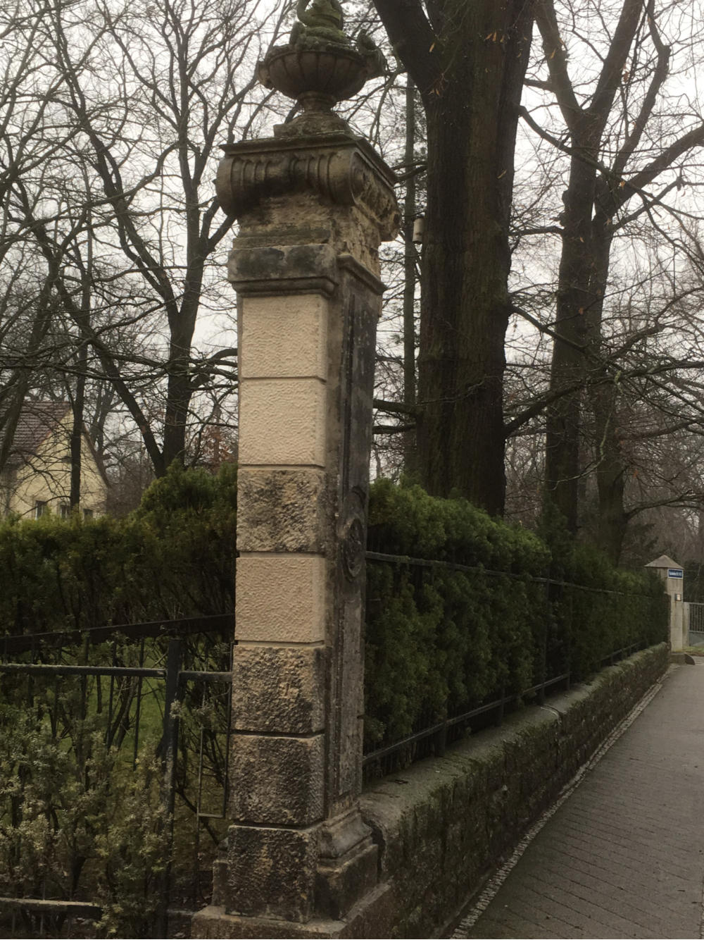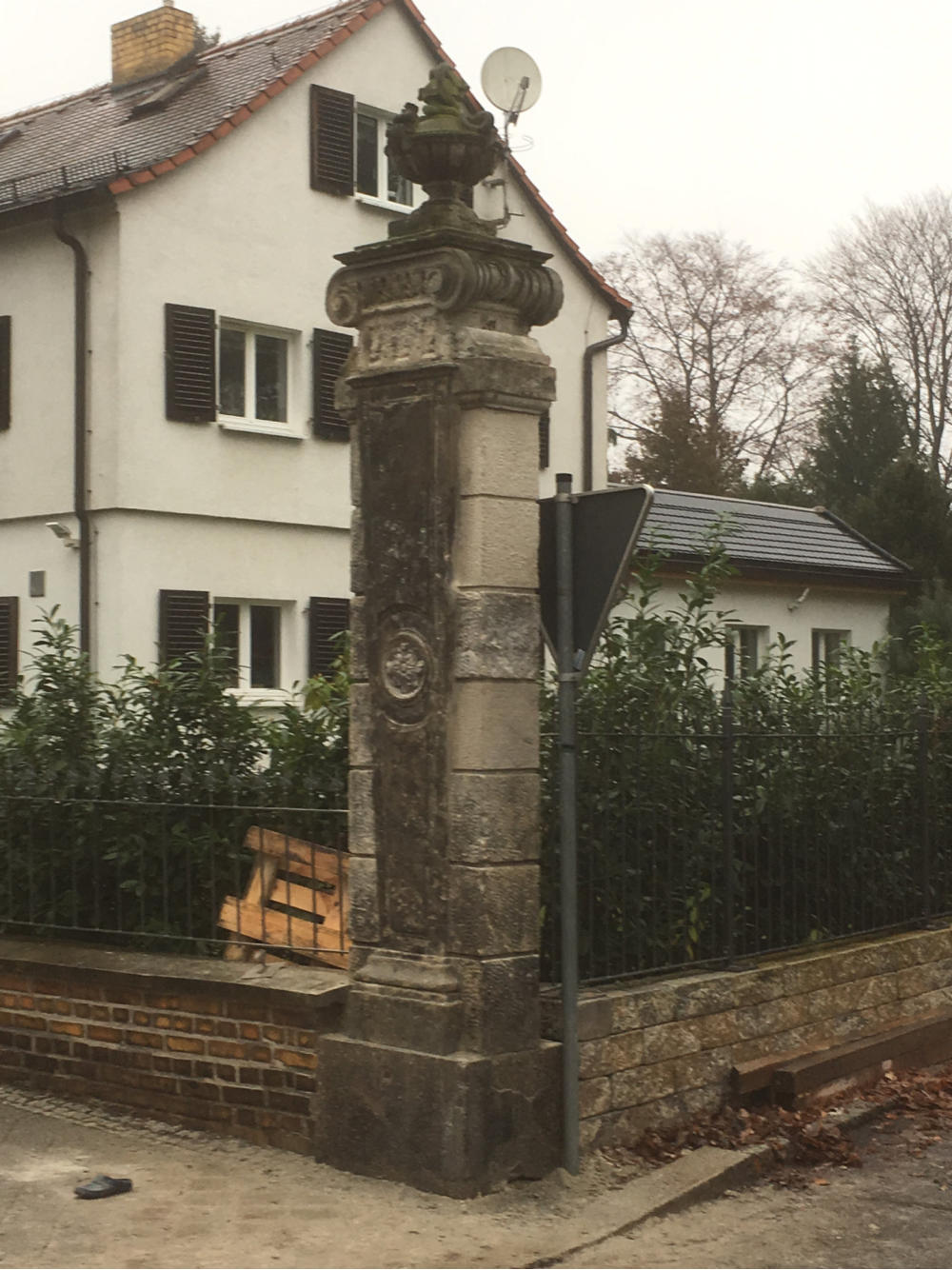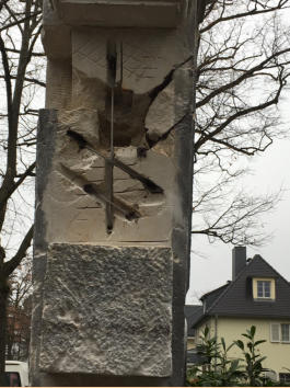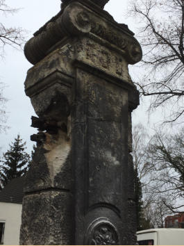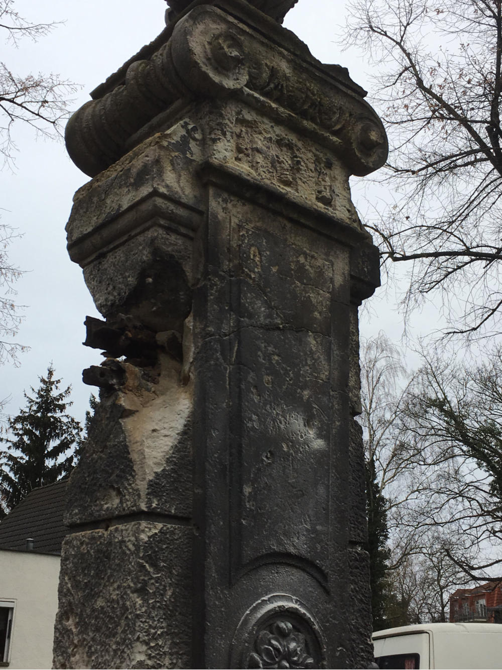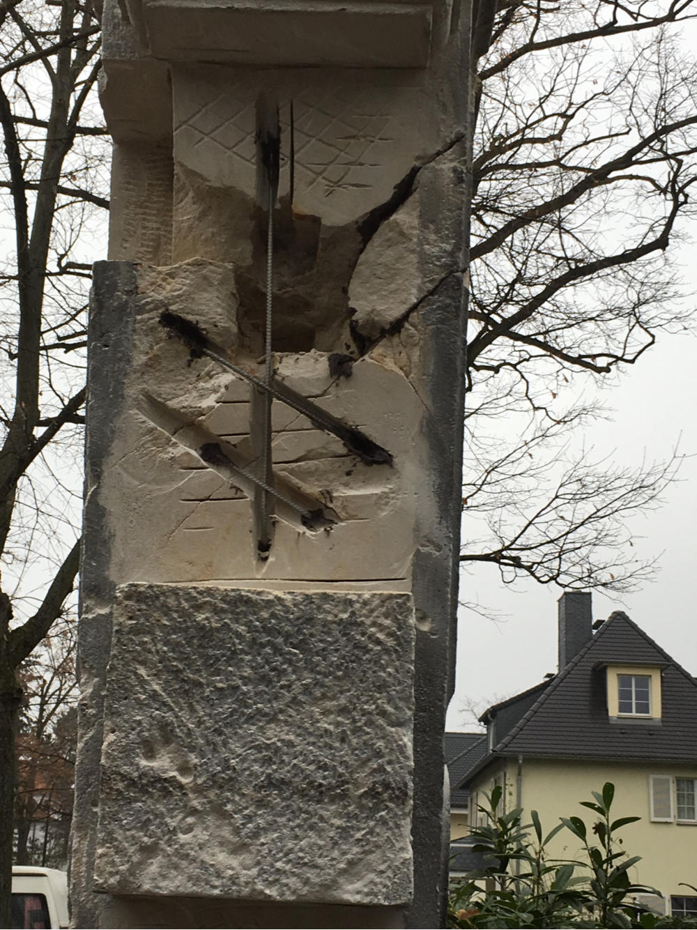 Die Pfeiler zeigten neben den typischen Verwitterungen auchgravierende Schädigungen durch “Rostsprengung”.Diese waren das Resultat der Eisendorne welche im Sandstein verankert waren und als Toraufhängung dienten.Nur durch umfassende Sicherungsmaßnahmen durch Anker und Klammern aus Edelstahl konnten die Pfeilergesichert und vor dem Abriss bewahrt werden.